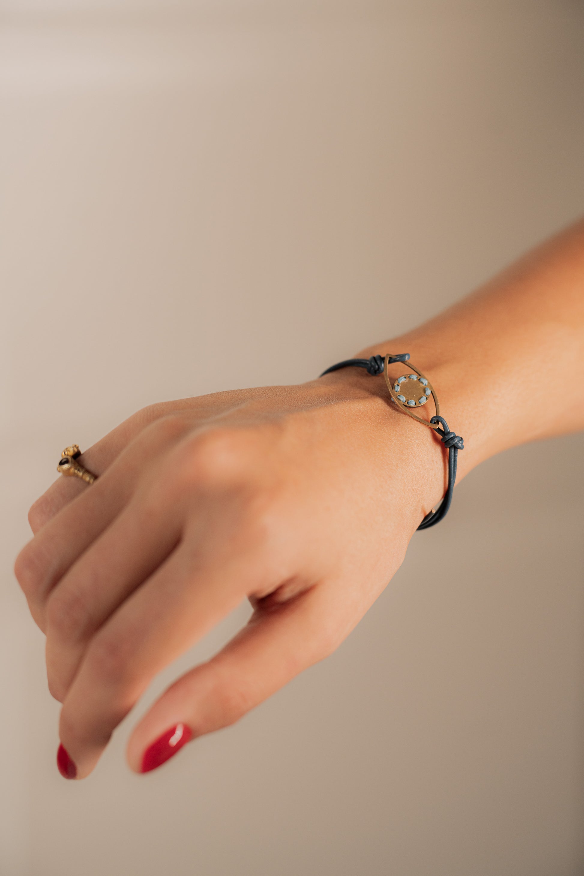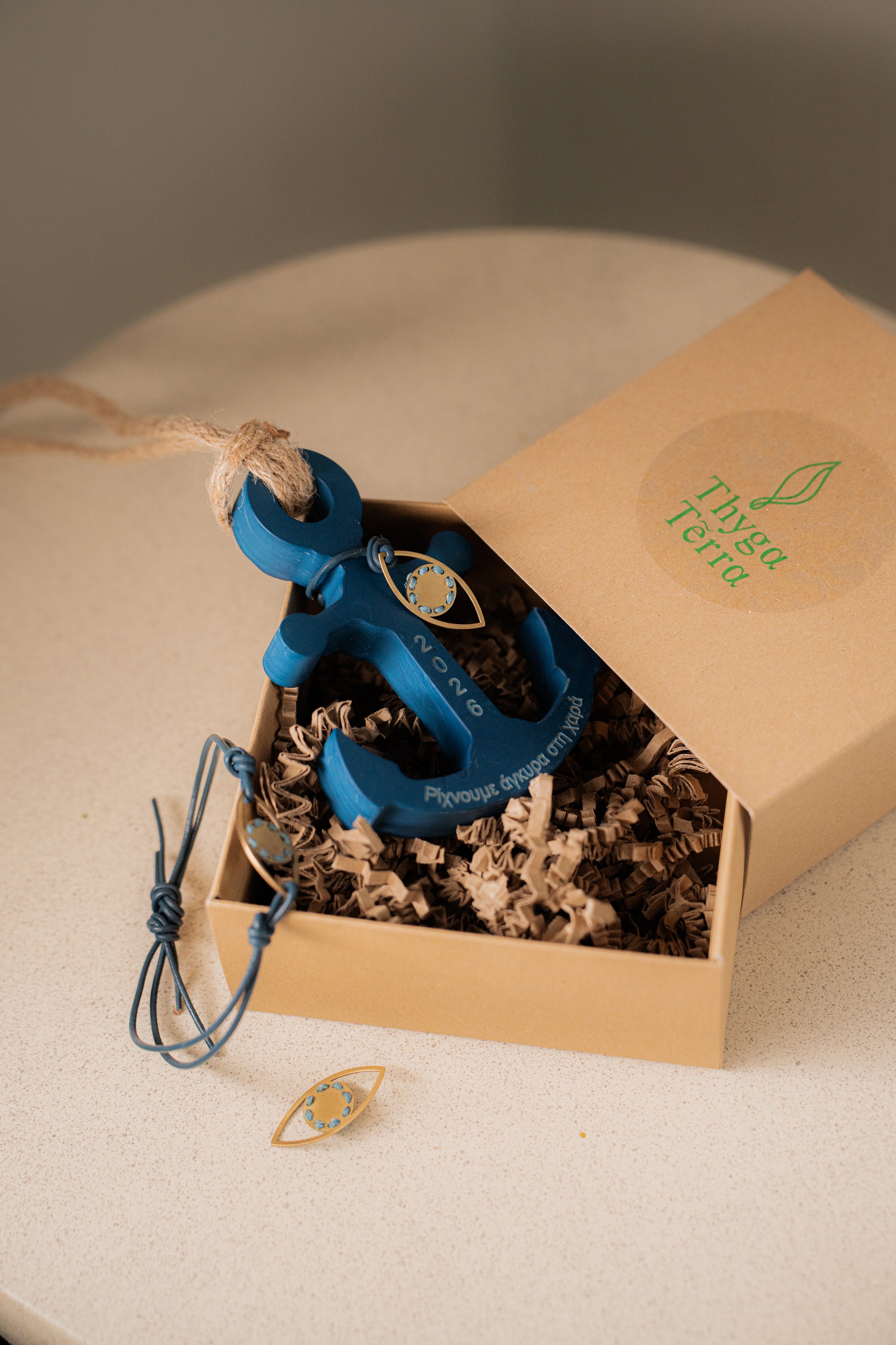 Handmade from eco-resin, in deep blue, engraved and adorned with a brass evil eye.